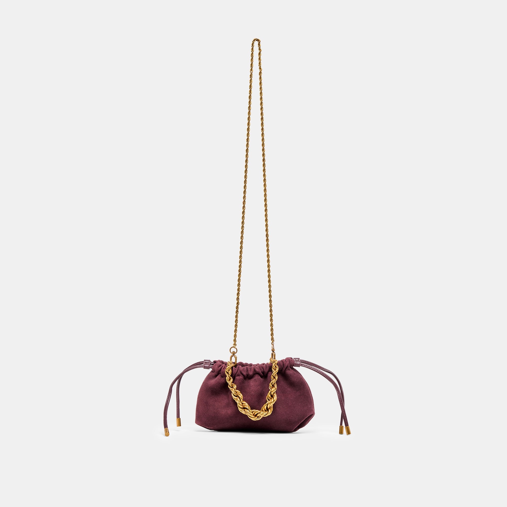 CLEO's luxurious details elevate any outfit. Rich suede hues meet a chunky gold chain. drawstring closure. and hands-free crossbody strap for a cool yet dressy accessory.